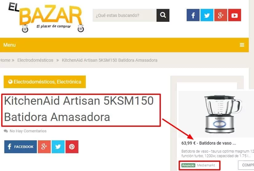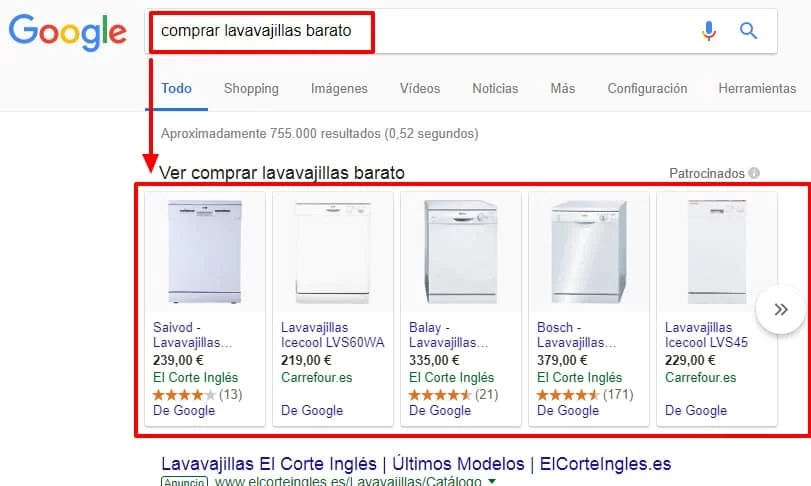 Los anuncios aparecen tanto en el buscador como en el comparador de precios cuando las palabras clave que tenemos definidas en la configuración de la campaña coinciden con la búsqueda del usuario.